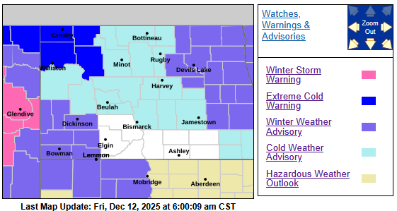 Cold weather headlines are in effect today through Saturday morning. The Extreme Cold Warning ends at noon today, otherwise the Advisory runs through Saturday morning.